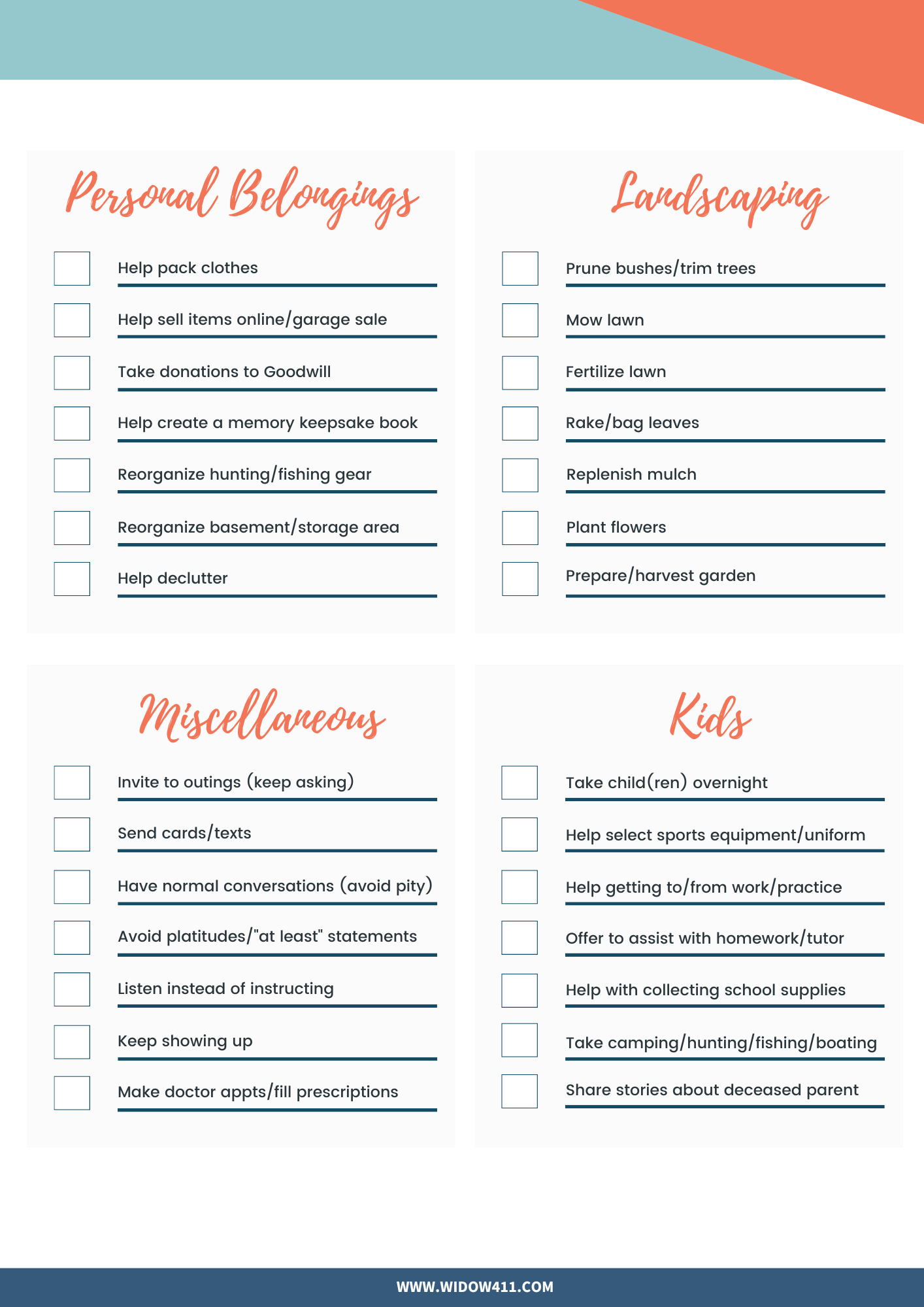 When someone says, “let me know if you need anything,” please share this printout and get help with the most pressing or time-consuming tasks.