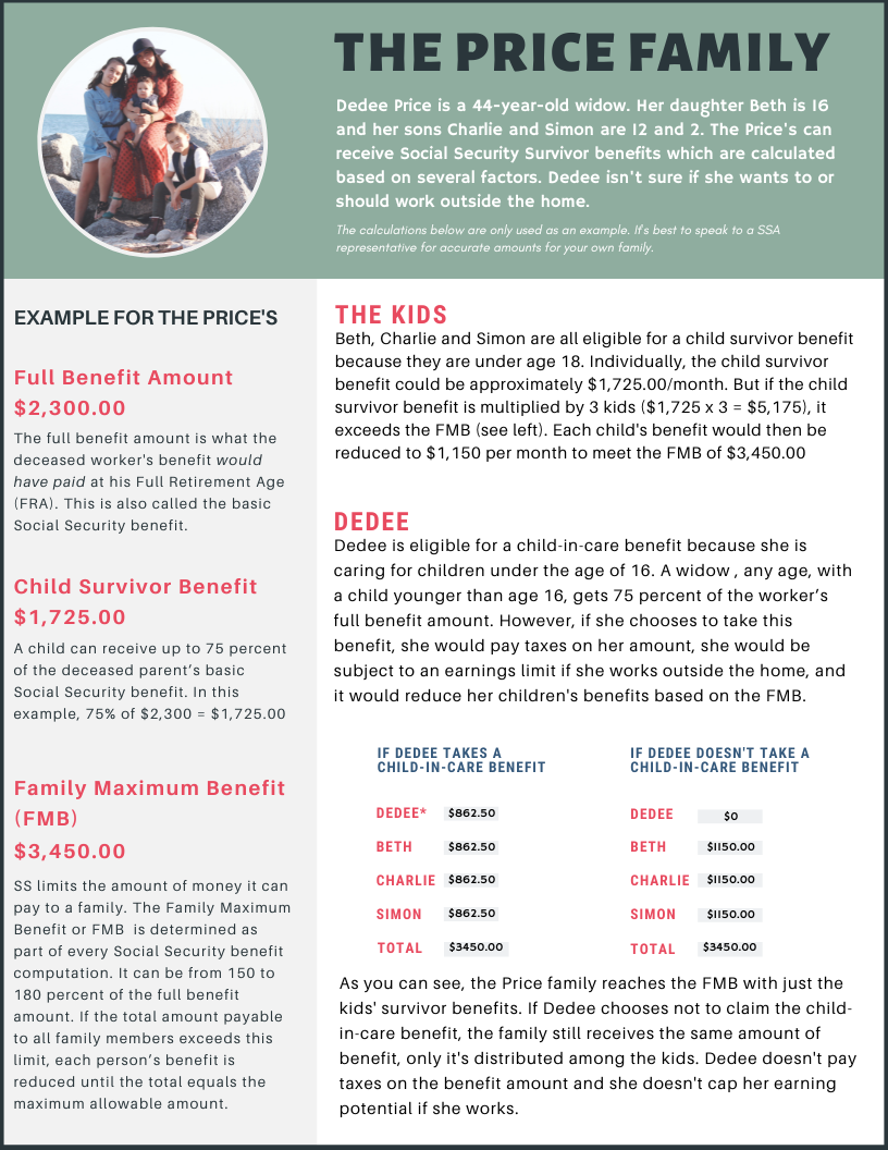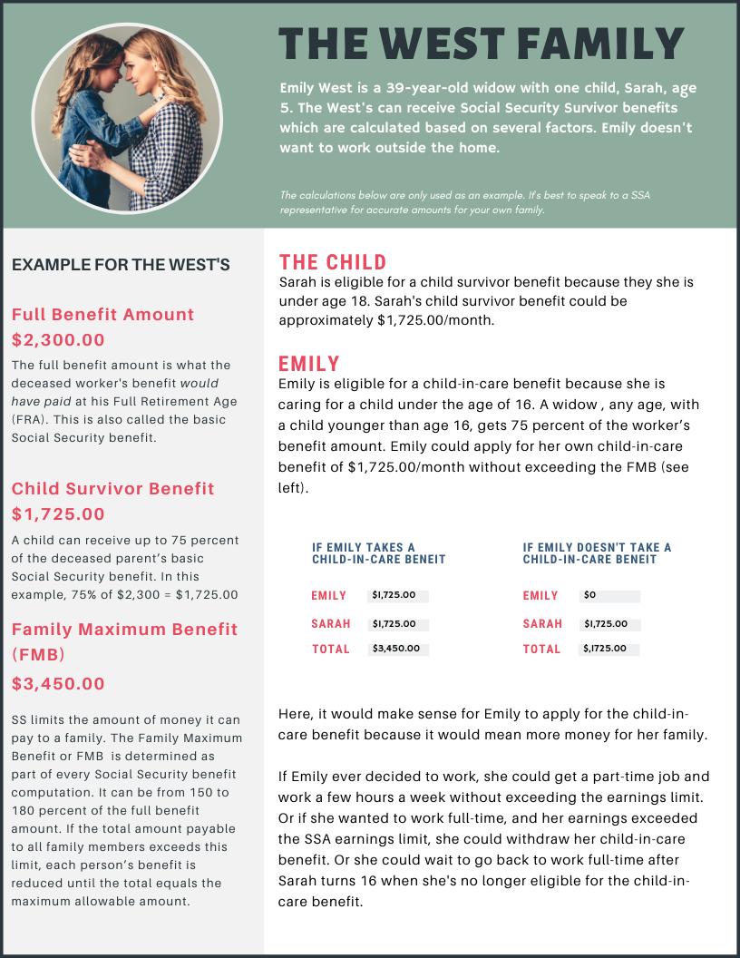 Now Dedee is eligible for a child-in-care benefit because she is caring for children under the age of 16. A widow, any age, with a child younger than age 16, gets 75 percent of the worker’s benefit amount unless that amount exceeds the FMB.