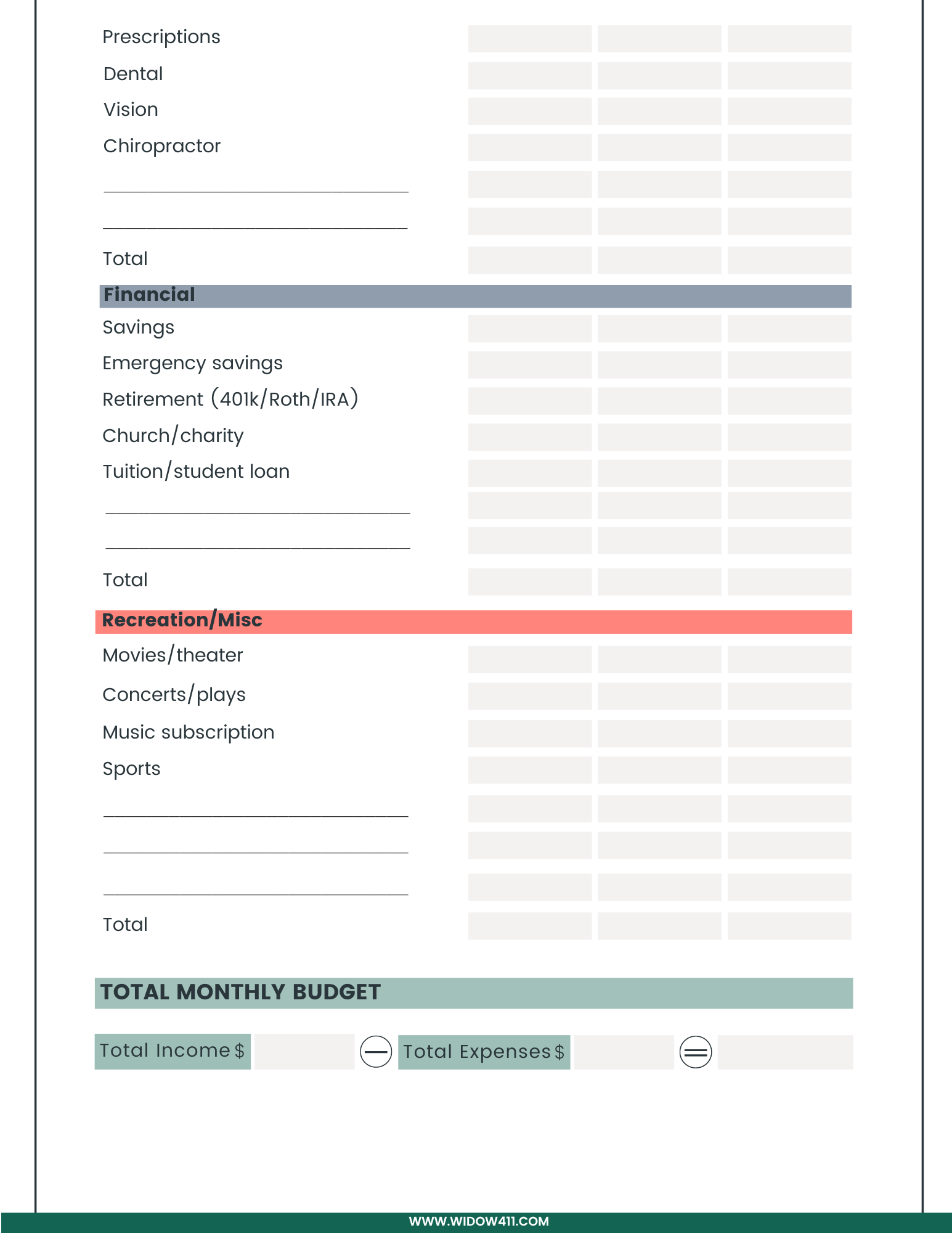 Download a copy of the Monthly Budget Planner to itemize monthly expenses in separate sections. You'll find this document under the Downloads section below.