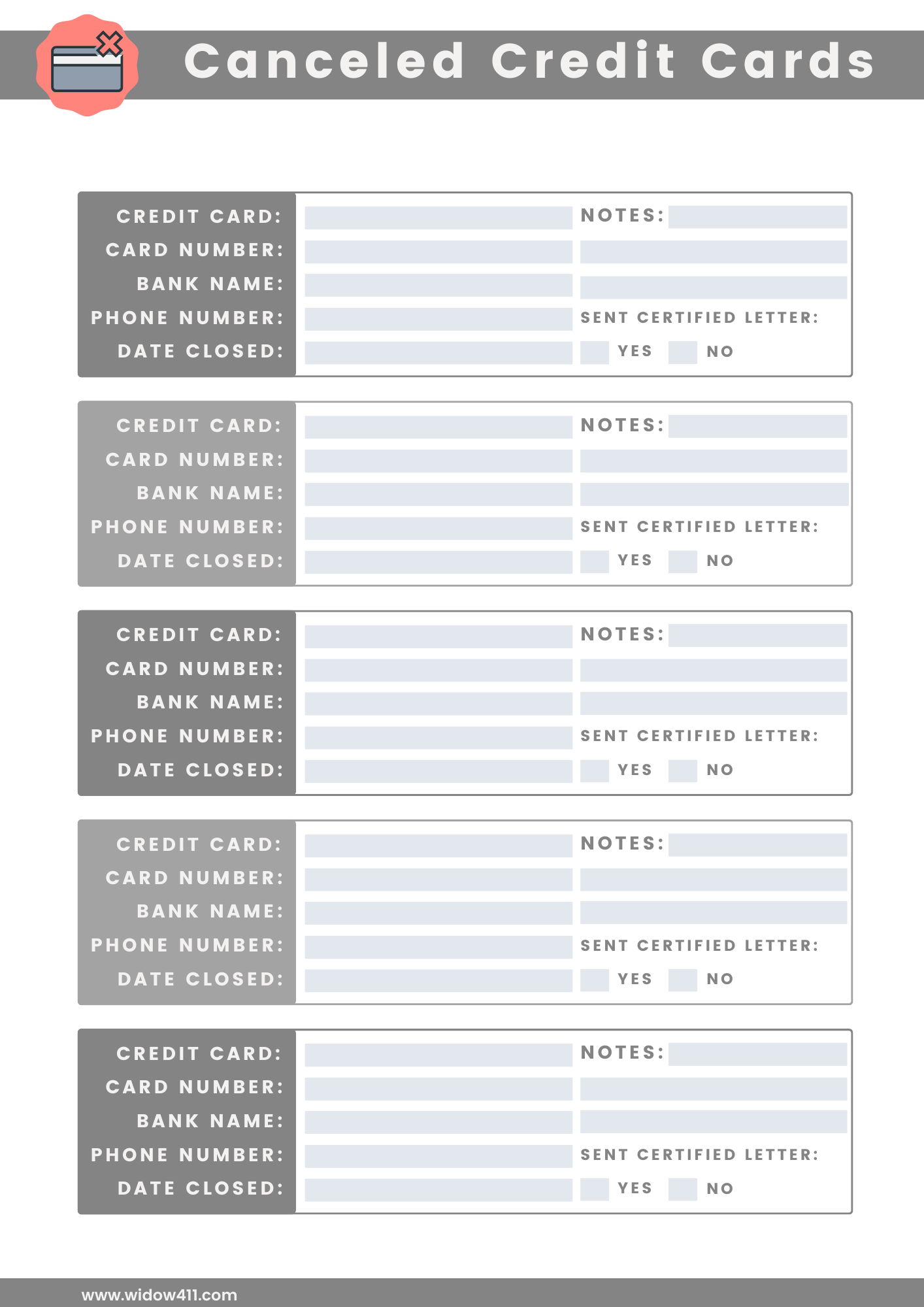 Use this Canceled Credit Cards worksheet to keep track of what credit card accounts were closed and when.